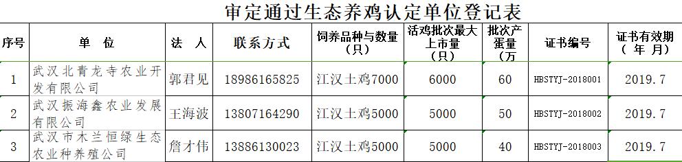 2018年湖北省审定通过生态养鸡认定的单位名单